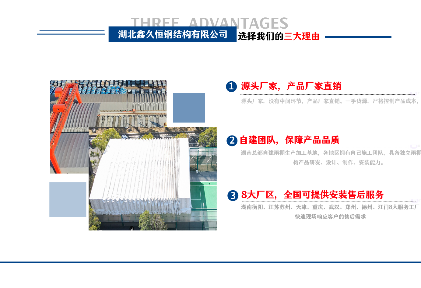 湖北鑫久恒鋼結構有限公司是一家電動雨棚、膜結構車棚研發,生產銷售,施工安裝于一體的專業鋼結構科技公司,主要產品有伸縮雨棚,電動雨棚,膜結構車棚等?! 『系貐^職員目前有80多人,占地面積20000平方米,廠房面積15600平方米,配備先進的生產流水線,使每件品質產品的堅實基礎?! 」驹谔K州、天津、重慶、武漢、德州、烏魯木齊、江門均設有服務工廠,總人員共300多人,擁有專業的技術團隊,配備先進的設備和流水線生產,產能高,貨源充足,發貨速度快,服務區域廣。  移動伸縮棚適用于通道臨時倉儲、戶外運動遮陽、污水池遮蓋、能源交通、熱力化工、礦山、船舶制造及市政建設、物流、碼頭等領域的構件制作加工,成品半成品存放、倉庫、野外儀器設備操作用房等。尤其是對工廠發貨、倉儲臨時遮雨防嗮,梅雨期較長、建設周期較短的工程施工等特別適用。還可根據用戶需求量身定制、適合企業所需不同款式的產品?! ∥夜緢猿帧罢\信社會為本,客戶滿意為榮”的經營理念,做到質量把控,嚴格管理,精益求精,恪守承諾。使鑫久恒逐步走向成熟,其系統化、專業化日趨完善。以專業的技術、科學的管理,更高的產品質量,優良的企業信譽,真誠的客戶服務,靈活多樣的經營方式和務實創新的企業精神愿與社會各界攜手合作,為推動智能鋼結構建筑事業的發展而不斷努力。...